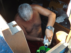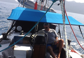 That is just what happened, the repair was completed in due time as we sailed towards the Limani - it was hot work, 30C outside, and a hot engine in. I topped up the engine coolant with hot water to elevate any other issues, all went well as Ann kept watch.