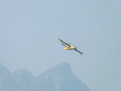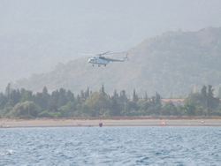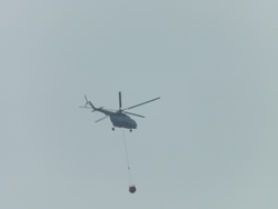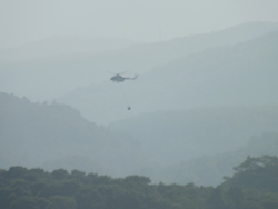 The fire must have still be burning somewhere as we passed by a helicopter, collecting sea water as we had seen the planes do, and, disappearing into the mist heading west up the valleys.