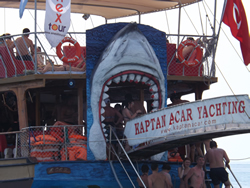 The boats come and go as they do every day, one caught my eye, with Turkish music blasting out, two guys dance on it's roof as they leave in tradition style.