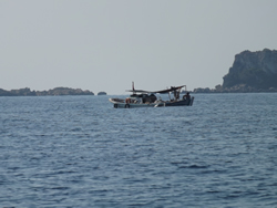 We turn wide of a small gathering of 4/5 fishing boats and then make our turn in land towards the shore to pass on the inside of the fish farms, a shorter route to Olympus.